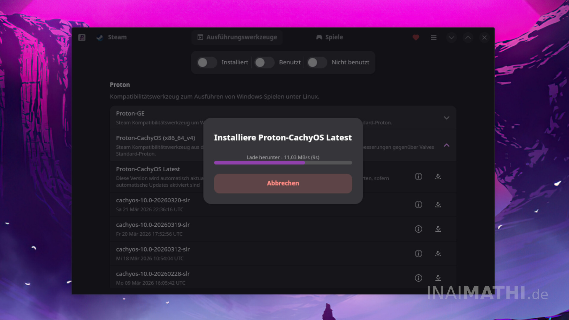 Die aktuellste Version von „Proton-CachyOS“ wird nun heruntergeladen und unter dem Dateipfad „/var/home/USERNAME/.local/share/Steam/compatibilitytools.d/Proton-CachyOS Latest/“ abgelegt.